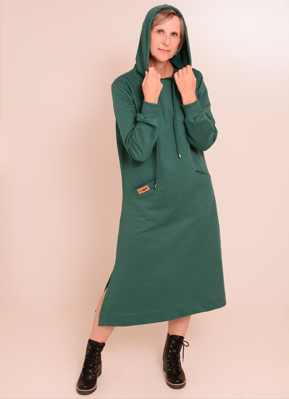 Vestido midi ML em moletom careca 2 cabos com capuz e bolsos frontais, fenda laterais de 30 cm